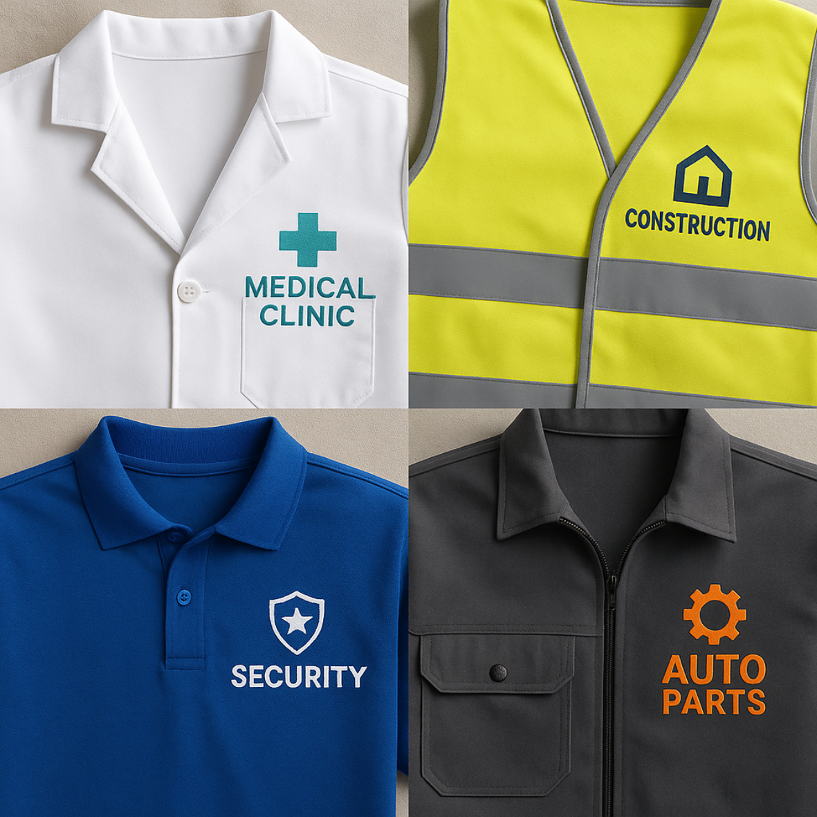 Особенность данной услуги в том, что вышивка применяется на самых разных видах спецодежды: халатах, медицинских костюмах, жилетах, футболках, куртках, толстовках, фартуках, комбинезонах, кепках и бейсболках. Это делает её универсальным решением для предприятий самых разных отраслей – медицины, строительства, охраны, сферы обслуживания, ресторанного и гостиничного бизнеса, торговли, логистики, транспорта и производства.