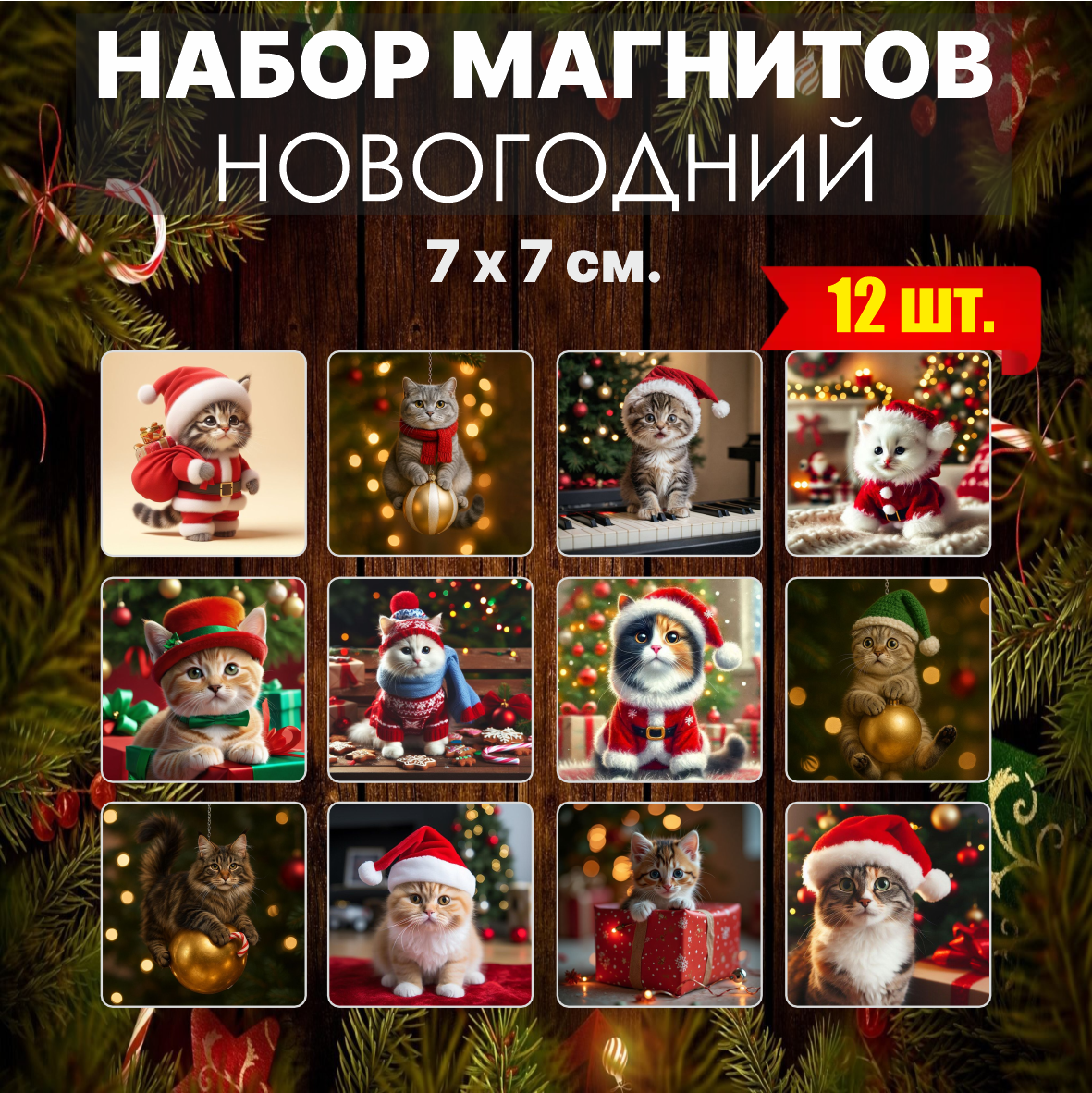 Набор новогодних магнитов “Котята” (12 шт, 7×7 см)